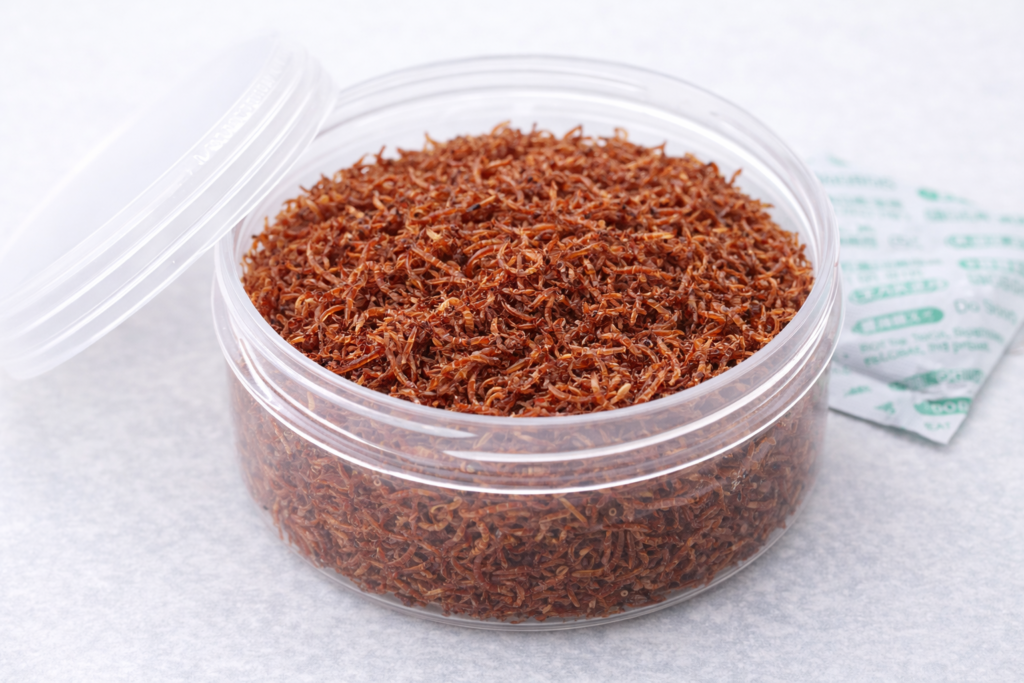乾燥アカムシは、冷凍や活アカムシと比べて腐りにくく、保存しやすい餌です。